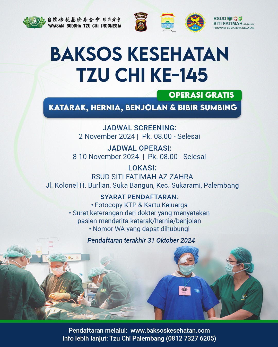 Pendaftaran operasi dibuka hingga 31 Oktober 2024, dengan persyaratan utama berupa KTP, kartu keluarga, dan surat keterangan medis terkait penyakit yang diderita. Untuk informasi lebih lanjut, masyarakat dapat menghubungi Tzu Chi Palembang di 081273276205 atau mendaftar melalui web.baksoskesehatan.com.